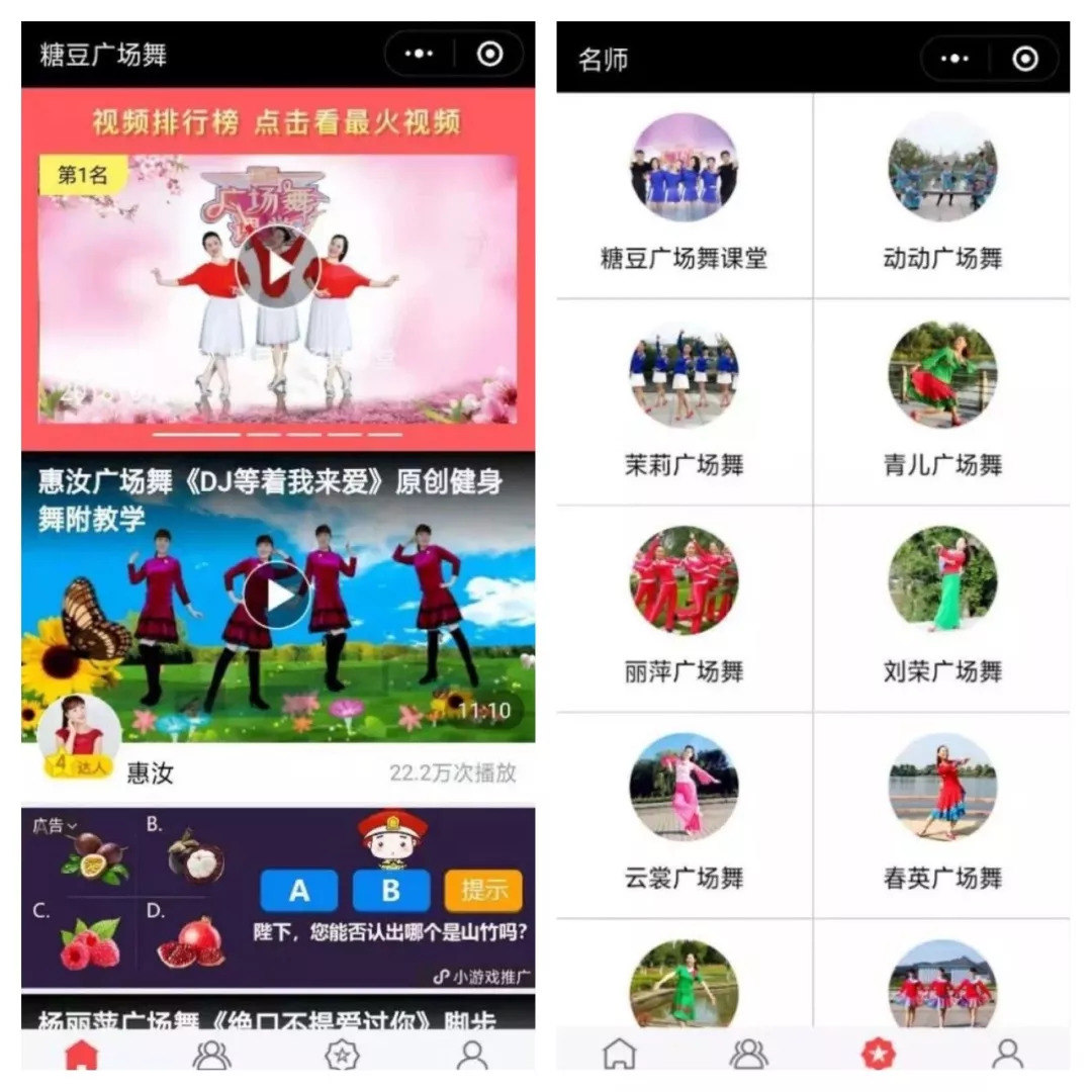 北大计算机专业出身的张远在2011年做了“糖豆网”,随后几年间,在PC端和后来的移动时代,糖豆都成为国内广场舞视频最大的“集散地”。手握着细分行业人群的糖豆,建立起了一套网站、APP、小程序以及OTT联动的布局。糖豆团队告诉娱乐资本论(id:yulezibenlun),糖豆服务的核心人群以中老年用户为主,但安装和使用APP对一些中老年用户门槛较高,但中老年用户在微信有很直接的社交场景。“OTT覆盖家庭型用户,APP覆盖领队用户,小程序覆盖的是舞队关系。”