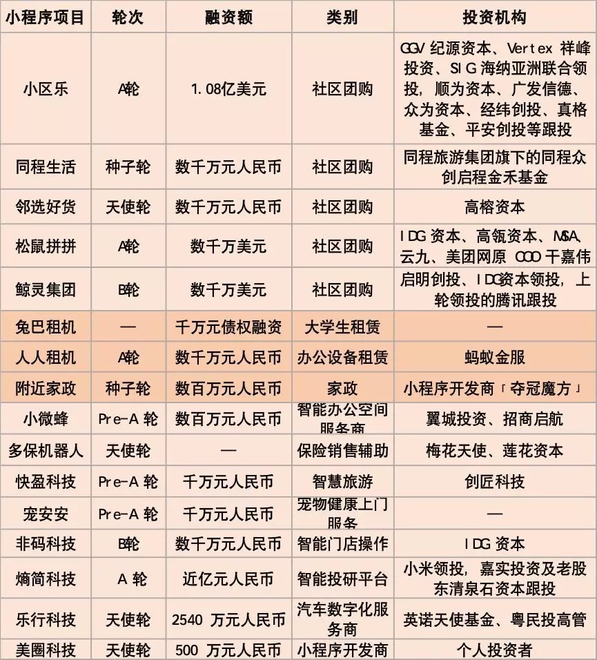从11月的小程序融资情况来看,社区团购项目继续获得资本青睐,同程内部孵化的“同程生活”起量,腾讯也参与了一笔社交团购小程序融资——领投鲸灵集团(旗下有好衣库和甩甩宝宝小程序)B+轮融资。支付宝小程序也开始发力,在11月获得多笔融资。