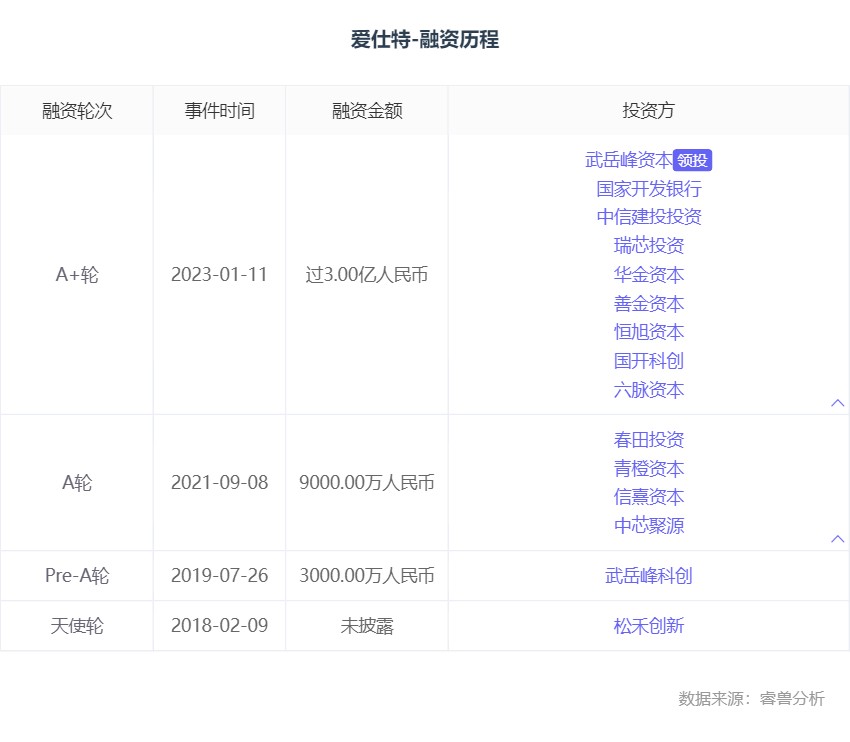近日,爱仕特完成A+轮融资,武岳峰资本武平总领投,国家开发银行、中信建投、瑞芯资本、珠海华发集团、香港郑氏集团、南通市政府、善金资本、产业资本上汽恒旭等相关或关联机构跟投,共计融资超过3亿元人民币。本轮融资将用于加速车规级SiC功率MOS芯片研发与技术创新。