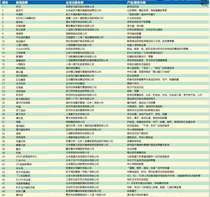 创业邦“中国高成长连锁50强”(Franchise 50)源自美国商业媒体《Entrepreneur》杂志每年进行的“美国连锁500强”(Franchise 500)评选。Franchise 500因其调研、分析的权威性和专业性成为全球连锁业发展的风向标。作为《Entrepreneur》在中国的独家授权合作伙伴,创业邦在2008年独家发起“中国高成长连锁50强”评选,聚焦中国的高成长性连锁企业。评选以实际调研为基础,着重考察连锁品牌的成长能力和潜力。