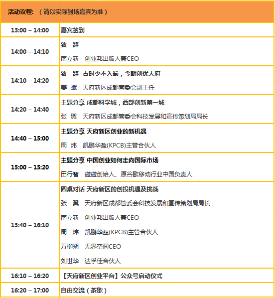 为了倡导“来天府投资,到新区创业”,成都天府新区联合创业邦举办“热情天府,遇见未来”专场沙龙,活动现场将对“天府新区发展战略、愿景,创新创业扶持政策、投资环境”做全方位的解读,旨在通过对天府新区独特优势的宣讲,大力引进和鼓励天使投资、VC(风险投资)为创业企业提供直接融资及创业辅导 、人才培训等一系列专业化服务,打造良好金融生态,同时招募优秀创业团队来川创业以及引进优秀创新型孵化器为新区企业服务。创业邦也将对在活动现场与天府新区达成意向入驻的企业开放BANG CAMP名额,一同助力川籍创业者。