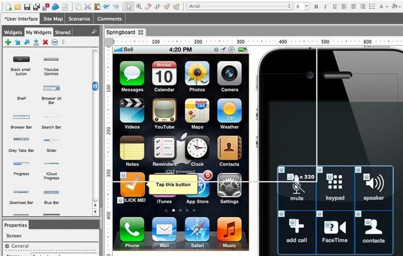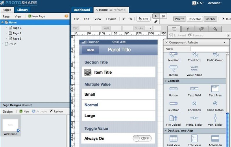 作 为一个强大的线框图和原型平台,Protoshare提供了大量移动工具集(有来自中心资源库的大量移动模版和大量2D、3D动画过渡)。通过“拖放”界 面,你可以快速创建交互式的线框图和移动原型,然后发送至iPhone、iPad或者Android设备进行测试,体验app的功能实现情况。
