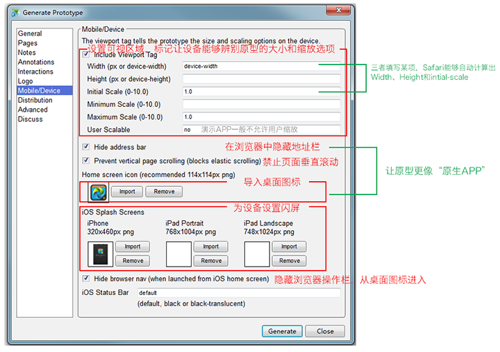 大 家都很熟悉了,这里主要说下移动端的演示,这样才充分表达原型意图。按F5生成原型的时候,在“Mobile/Device”选项中可以设置适配移动设备 的特殊原型(Axure 6.5以下版本),再用移动设备访问你生成的原型链接即可(该页面创建一个桌面快捷方式)。