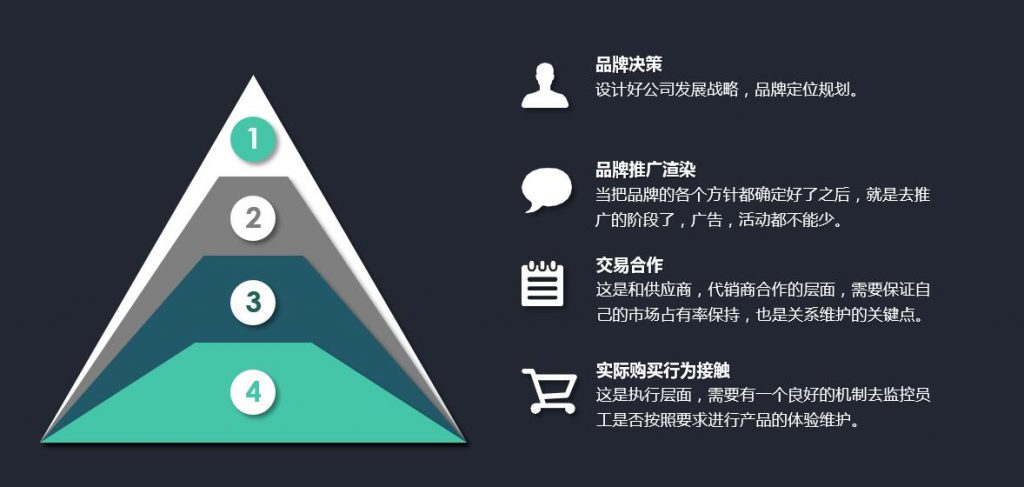 这里的内容太多太杂,简单可以涵盖几个品牌logo,品牌代言人,品牌口号,品牌营销规划,品牌价格指定,品牌销售方案,如果涉及到代理商,那就更加复杂了。不过没关系,有了之前的基础信息,这下细致的规划会逐渐落地。就像是之前搭好了钢筋,现在要往里面灌水泥一样。这个时候要注意分工,懂宣传的打通渠道,懂销售的指定营销方案,懂管理的配备人员,分工明确,且一定要相互合作,这个阶段一定要多开会,多讨论,共同打造。