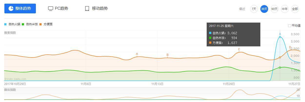 ▲2017年11月25日之前自热火锅的搜索指数没有被收录,却于当日异军突起,几乎是方便面热度的两倍