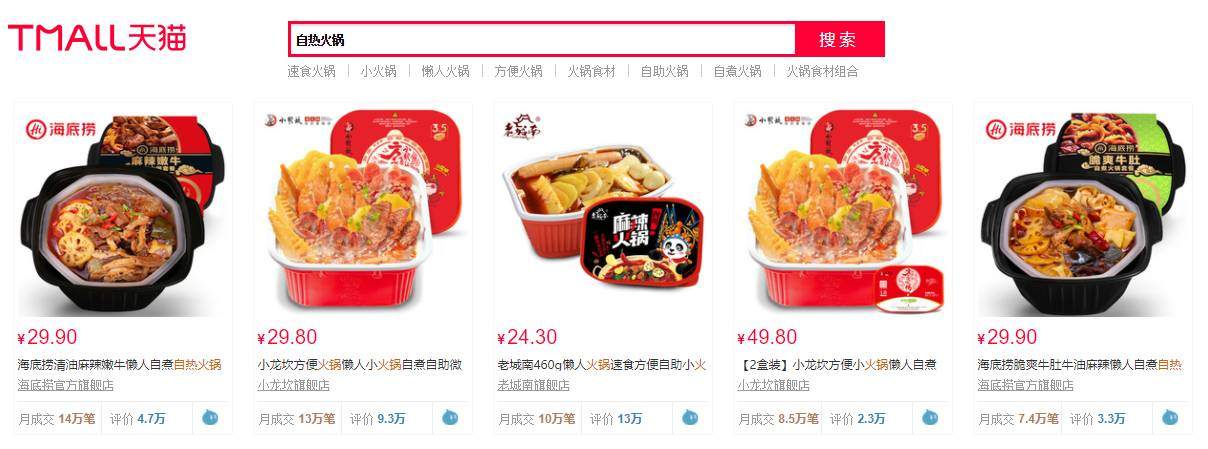 自热火锅在天猫爆红,也吸引了海底捞这样的全国连锁品牌入局,如今连三只松鼠、卫龙、良品铺子这样的零食品牌都来跨界抢占这一新兴市场。
