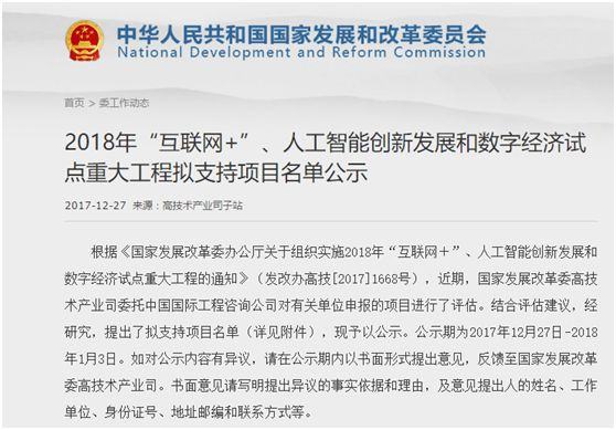近日,国家发改委公布《2018年“互联网+”、人工智能创新发展和数字经济试点重大工程支持项目名单》,在2017年“互联网+”重大工程的基础上增加了人工智能、数字经济两个新分类,明确依托云从科技建设人脸识别产业化及应用项目,云从科技也成为计算机视觉头部企业中唯一入选的企业。