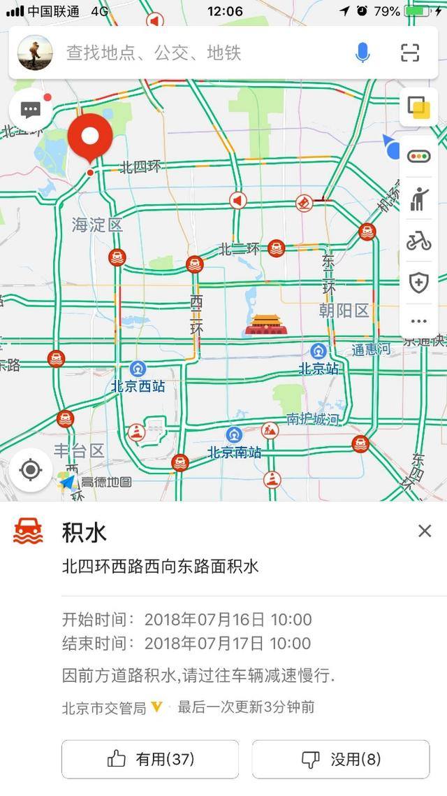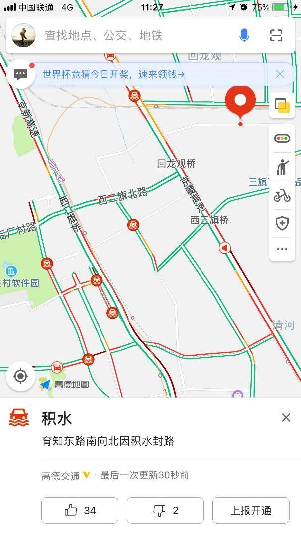 图注:高德积水地图显示,北京回龙观、西二旗等地道路积水严重