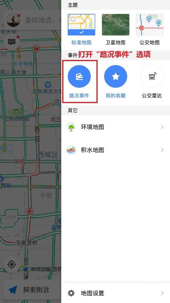 用户只要打开高德地图中的“路况事件”选项,即可在地图首页中查看到积水点位置和相关信息。