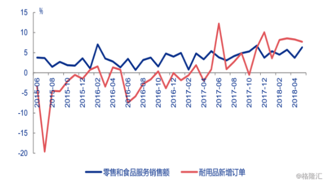 美国居民储蓄不断上升,消费者信心也不断攀升。美国储蓄和消费者信心指数来看,2018年美国居民储蓄不断上升,第一季度达到34262亿美元,消费者信心也不断攀升,3月份达到101.4,处于十几年来的最高水平,不过从4月份开始有所下滑。随着居民储蓄上升,居民对零售、食品服务、耐用品的消费都有所提升,5月份零售和食品服务的销售额同比增长6.35%,耐用品新增订单增长7.7%。