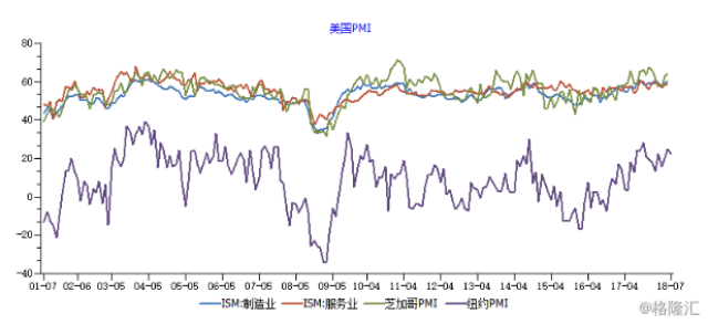 美国PMI值上行,说明整体制造业处在一个较好的阶段,制造业经济在增长,自今年年初起美国PMI数值有所波动但整体呈上升趋势,6月为56,短期美国经济小幅度波动,但随着美国建筑许可房屋、成屋销售、耐用品订单指标的上升,整体经济景气度良好。