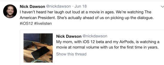 不久前,Twitter用户发文称,他将iPhone放在电视旁,让听力不佳的母亲通过AirPods配合LiveListen功能,与家人一起像普通人一样观看了一场电影。在Twitter中他写道: