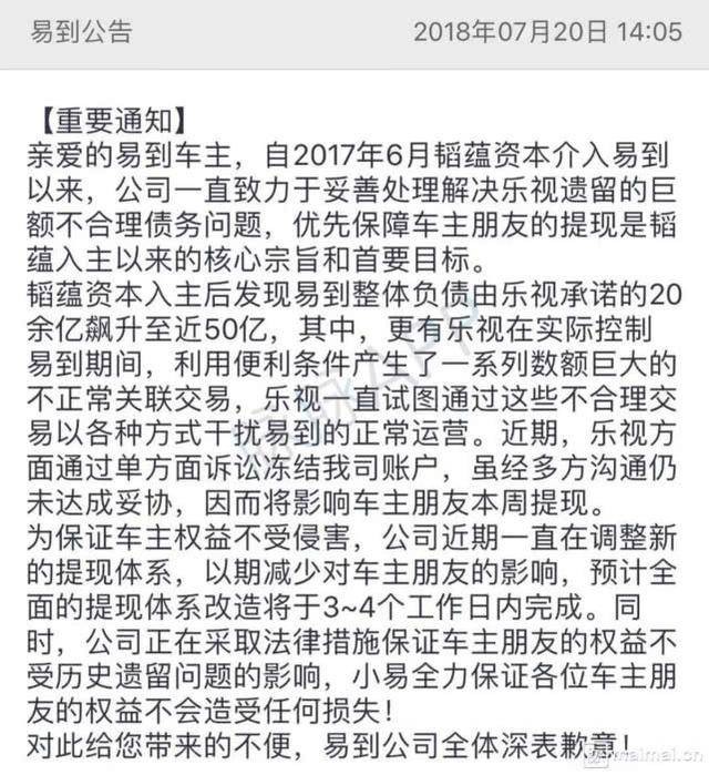 5月20日,易到发消息称“近期,乐视通过单方面诉讼,冻结易到账户,虽经多方沟通仍未达成妥协,因而将影响车主朋友,本周提现。为了减少对易到车主的影响,新的全面体系改造将于从今日起的3到4个工作日内完成。“与此同时,已经入主易到的韬蕴资本在近日称其入主易到后发现易到整体负债由乐视承诺的20余亿飙升到近50亿。