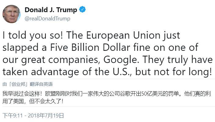 对此,美国总统特朗普在 Twitter 上发表推文,怒斥欧盟在利用美国,言语中颇有来日方长算总账的意味。