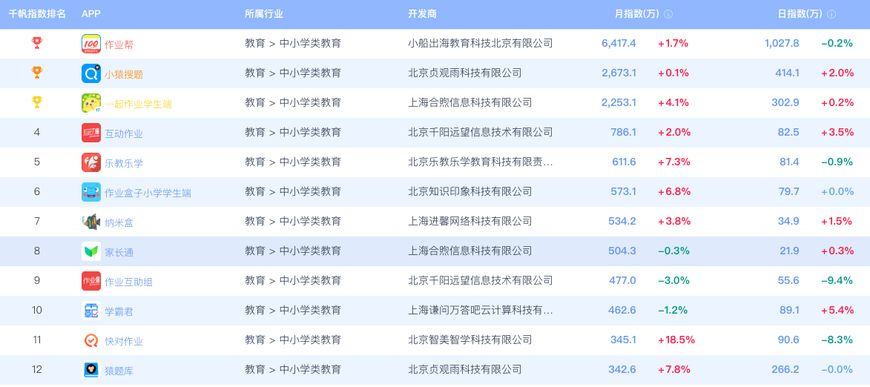 千帆指数报告显示,作业帮的月活跃指数达到6417.4万人;小猿题库的月活跃指数为2673.1万;一起作业学生端月活跃指数为2252.1万,累计超过一亿人。