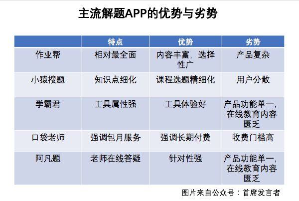 解题APP中,通过分析发现,做的最好的有作业帮,小猿题库、学霸君、口袋老师和阿凡题,下面我们来研究下他们各自有自身的优势与劣势。