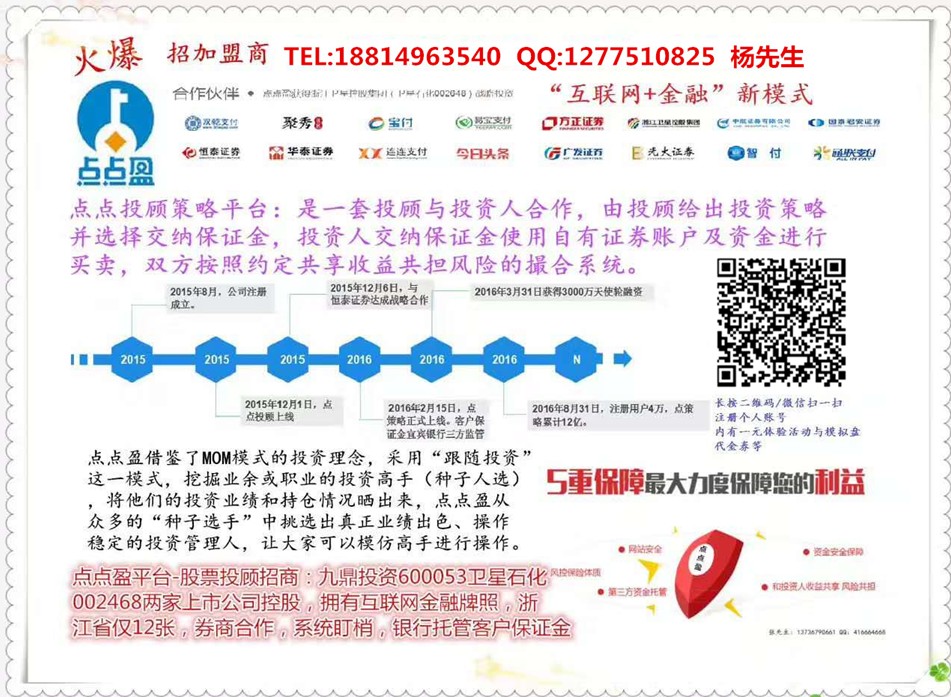 点点盈是杭州科地资本集团有限公司旗下的互联网金融服务公司,拥有互联网金融牌照,浙江省仅12张,九鼎投资600053与 卫星石化002468强势控股,公司高级管理团队及顾问由陈刚、黄晓捷、陈宇等资深的金融行业和互联网行业的专家组成。 点点盈以互联网券商为主要发展方向,致力于为公众提供包括互联网券商经纪业务、标准化金融产品互联网销售等互联网金融业务,集合了证券、炒股和金融等多方的人力资源,在成熟的互联网金融平台上容纳了不同层次的理财人群,点点盈这样的MOM跟随模式在一方面放大了炒股资金的量,提升了理财炒股人的收益;另一位方面,打开了互联网金融发展的大门,不管从哪个角度来分析,其自动止损的自动化管控,都将金融配资角色的收益者地位拉升到了一个新的高度。