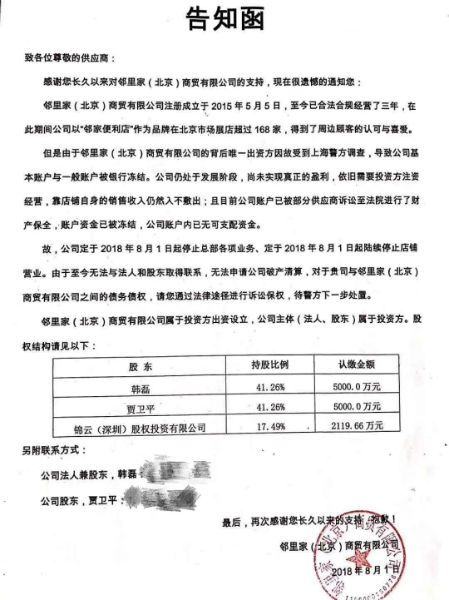 根据“告知函”显示,邻里家(北京)商贸有限公司背后唯一的出资方因故受到上海警方调查,导致公司基本账户与一般账户被银行冻结。公司仍处于发展阶段,尚未真正实现盈利,依旧需要投资方注资经营,靠店铺自身销售收入仍然入不敷出;且目前公司账户已被部分供应商诉讼至法院进行了财产保全,账户资金已被冻结,公司账户内已无可支配资金。