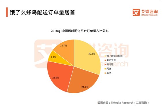 在2018Q1中国即时配送平台市场份额中,即时配送平台市场份额被饿了么的蜂鸟配送、美团专松,京东的新达达占据了前三,占比分别是30.2%、24.1%、23.9%。在这些玩家的背后分别对应的是阿里、美团、京东,各自占有的资源优势让它们在即时配送领域异军突起。