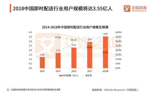 随着巨头在新零售领域的加速推进,新的物流体系也应运而生,即时配送就成了新物流体系中的主体。用户消费升级除了体现在对产品品质的追求上,时效跟服务显得越来越重要,即时配送由于快速、便利的优势备受消费者青睐。据艾媒发布的《2018Q1中国即时配送市场研究报告》,2018中国即时配送行业用户规模将达3.55亿人,在新零售的带动下即时配送需求也在加大,可以预见的是在未来即时配送行业用户规模仍有很大发展潜力。
