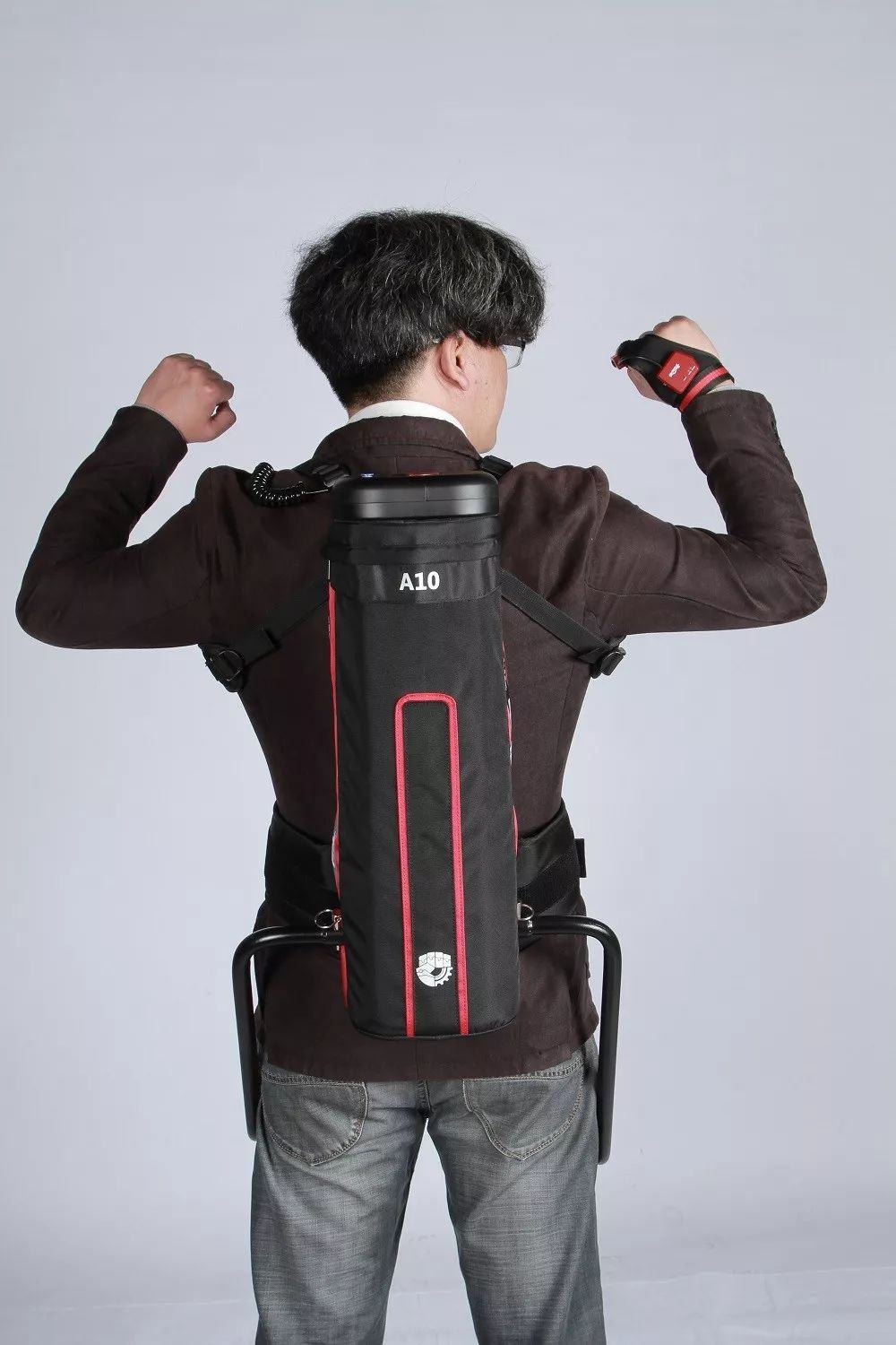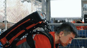 “我们曾经进行了极限测试,找了一个仓中最厉害的两名工人,请他们在分别佩戴和不佩戴外骨骼的情况下,短时间完成搬运 20 千克水 500 次的任务”。