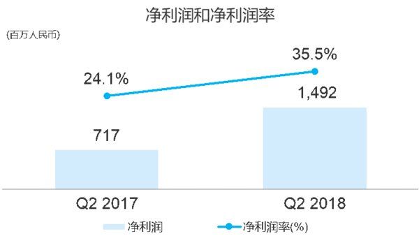 第二季度净利润为14.92亿元,对比去年同期7.17亿元,同比增长108.1%。第二季度基本和摊薄每股美国存托凭证收益均为2.07元,对比去年同期均为1.00元。