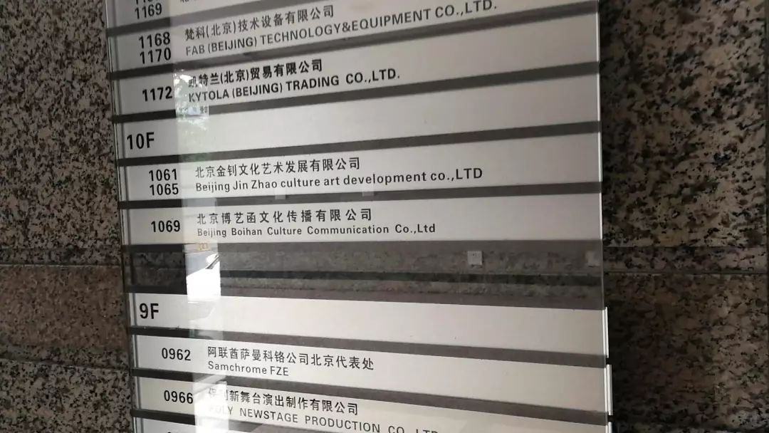 根据工商局注册信息,我们探访了范冰冰工作室——北京美涛中艺文化传播有限公司,北京朝阳区二环附近某大厦1068室即为该工作室注册地点。在一楼大厅的公司列表铭牌上,并无1068的公司铭牌。