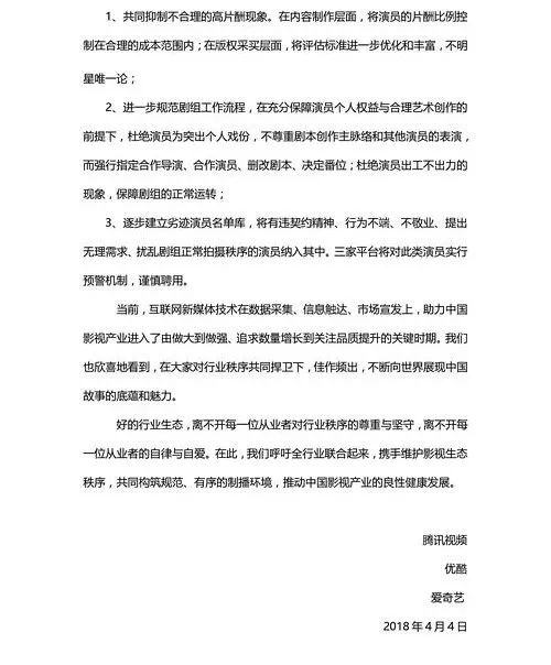 今年4月,优酷、爱奇艺和腾讯就曾联手对外发布了《关于规范影视秩序及净化行业风气的倡议》,对影视行业明星天价片酬、劣迹演员、明星效应过分夸大等乱象提出整改意见。
