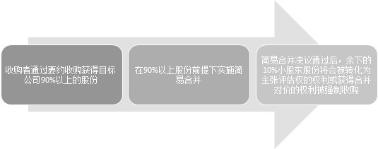 通常的操作分为先要约收购目标公司90%股份,再通过简易合并决议强制要求剩余小股东以获得现金或是债券、可赎回优先股为代价放弃目标公司股份。