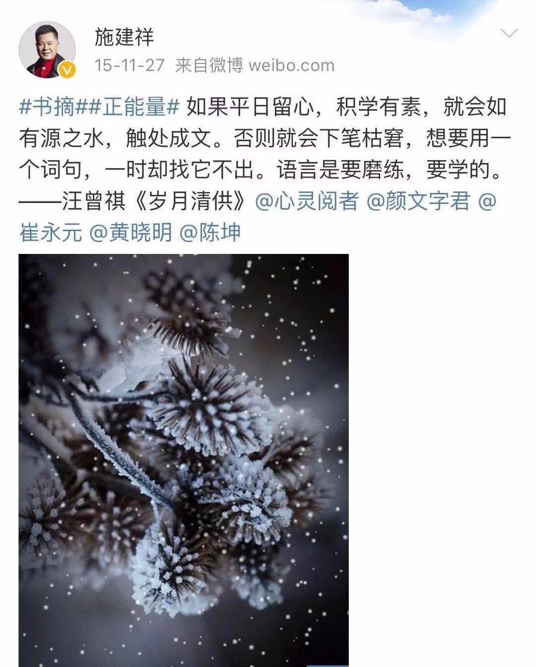 他请崔永元担任《大轰炸》的艺术顾问。平时读到一句走心的鸡汤,都要在微博上@他的圈中好友们。
