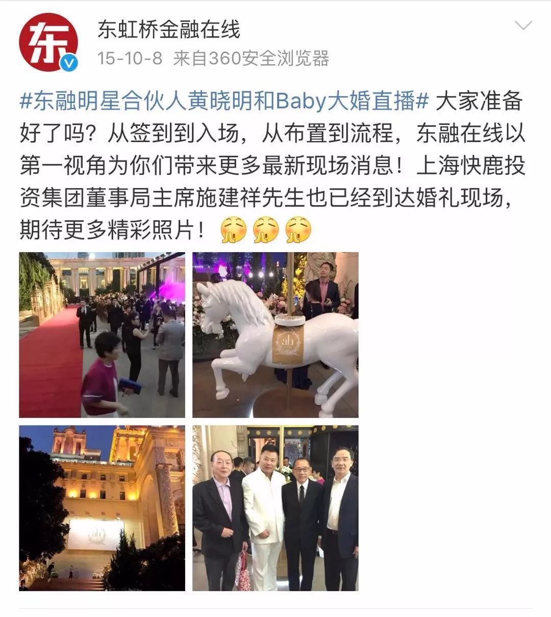 施建祥去参加婚礼那天,东虹金融在线还在微博上全程直播了公司合伙人的世纪婚礼,毕竟,都是自己家的事儿嘛。