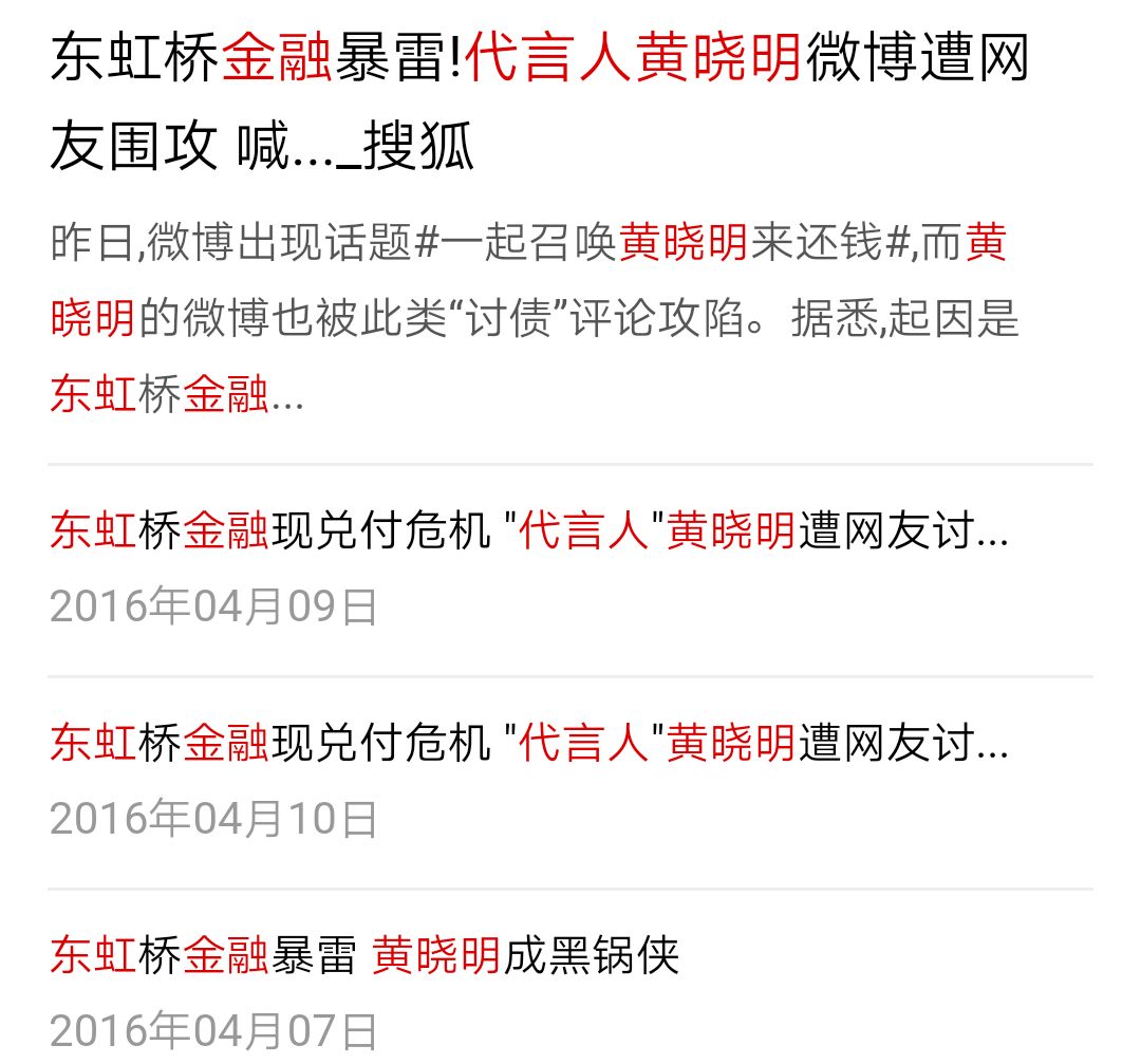 2016年3月,《叶问3》被爆出票房造假,资本游戏一环套一环的快鹿系公司相继深陷兑付危机。其中包括,黄晓明担任“明星合伙人”的东虹金融在线。