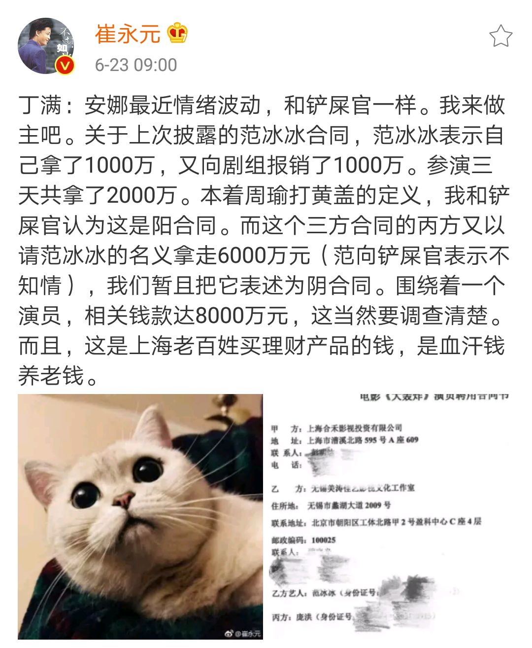 在施建祥被纳入红通名单的一周前,《大轰炸》艺术顾问崔永元,爆出一位女演员在片场只呆了四天,却通过阴阳合同拿走6000万,被爆的女演员,直指在《大轰炸》中戏份不多的范冰冰。