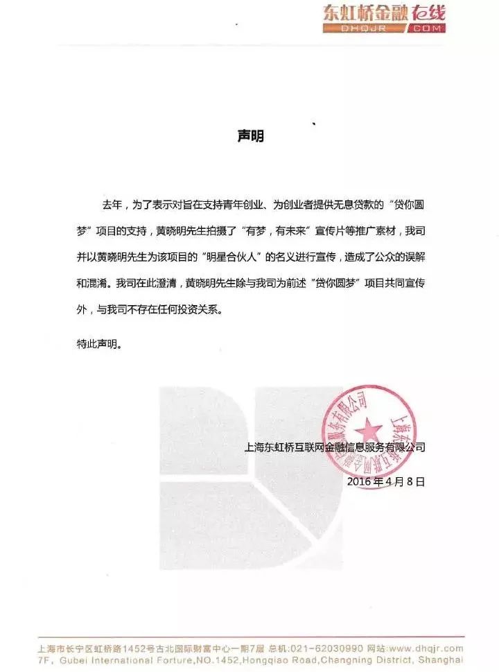 黄晓明成为了施建祥旗下互联网金融平台东虹金融在线的代言人,用东虹金融在线自己的说法,公司的“明星合伙人”。