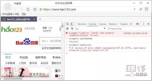 而继续在控制台输入navigator.appVersion返回的结果是:Chrome/49.1.2623.213。这居然还是49.1版本的谷歌浏览器内核。