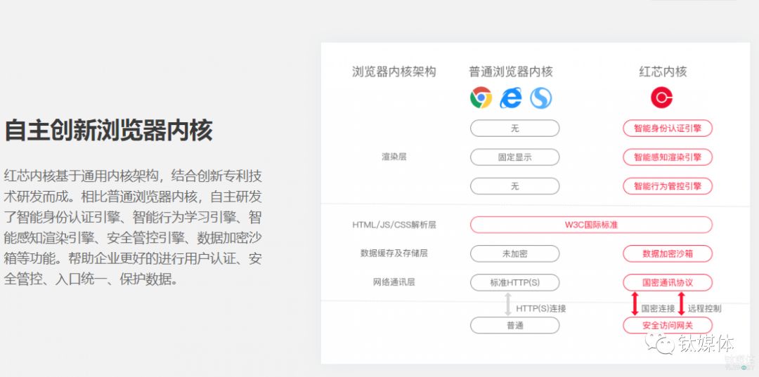 而在红芯企业浏览器官网也成,红芯内核基于通用内核架构,并将红芯内核与Chrome、IE浏览器等并列。