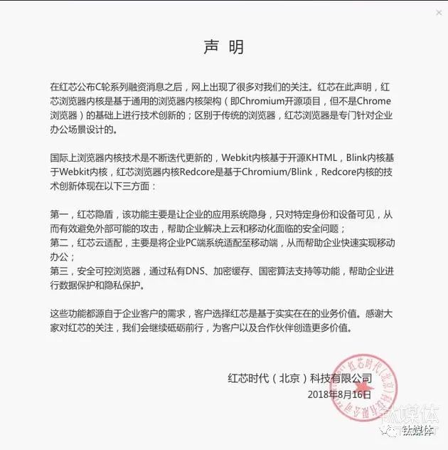 红芯时代公司也发出官方声明,红芯浏览器内核架构(Chromium开源项目)基础上进行技术创新,红芯浏览器是针对企业办公场景设计的。