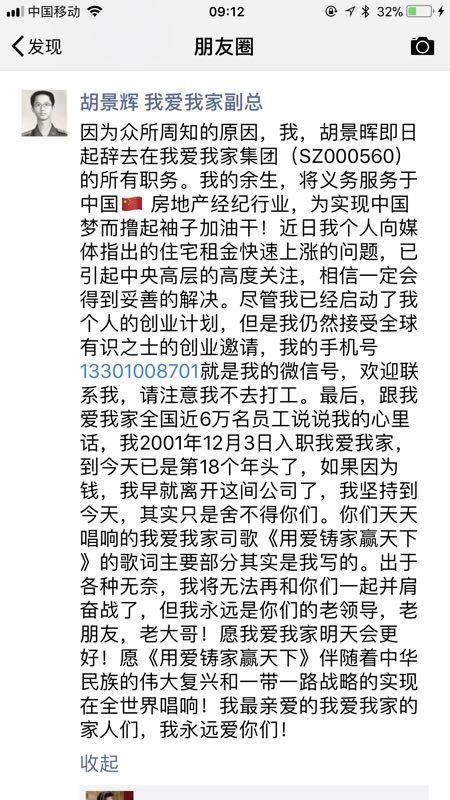 8月18日早间,我爱我家副总裁胡景晖在朋友圈宣布辞职。