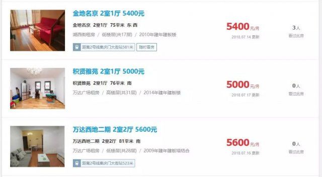 再看南京,6 月份的平均房租是 2774 元 / 套。然而,像地铁 2 号线集庆门站区域,80 平米的小两房,价格都在 5000 元以上。