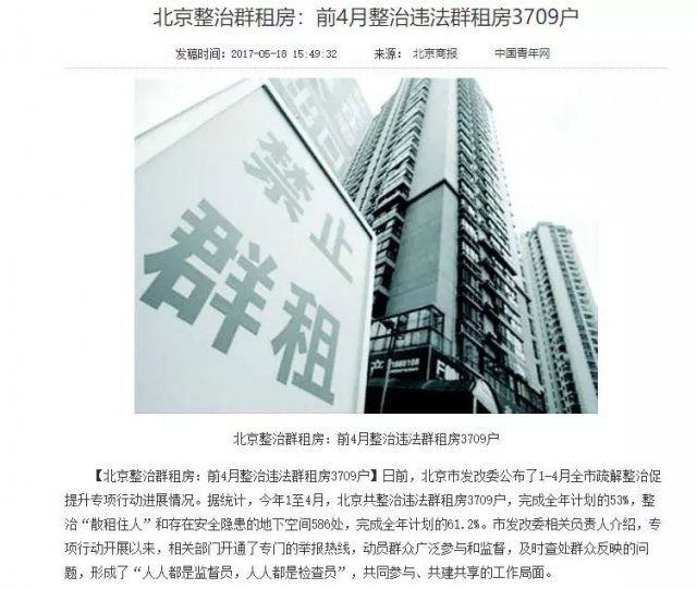 看数据,2017 年 1 — 4 月,北京就整治违法群租房 3709 户,全年预计在 7500 套。也就是说,北京租房市场,变相减少了 1 万余套房源。