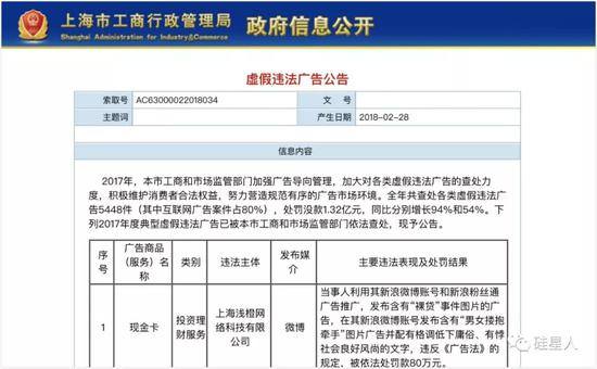 另外,今年上海市工商局发布有关虚假违法广告整治的公告,浅橙科技赫然在列,而且在公告中排名第一,被依法处罚款80万元。原来,该公司在微博上发布“裸贷”事件图片的广告并配有格调低下庸俗的文案,违反了《广告法》。