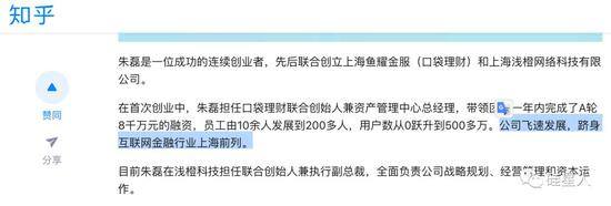 在那篇知乎专栏文章里,朱磊被形容为“一位成功的连续创业者”。他之前创办的公司焦作上海鱼耀金服,做的产品叫做口袋理财。