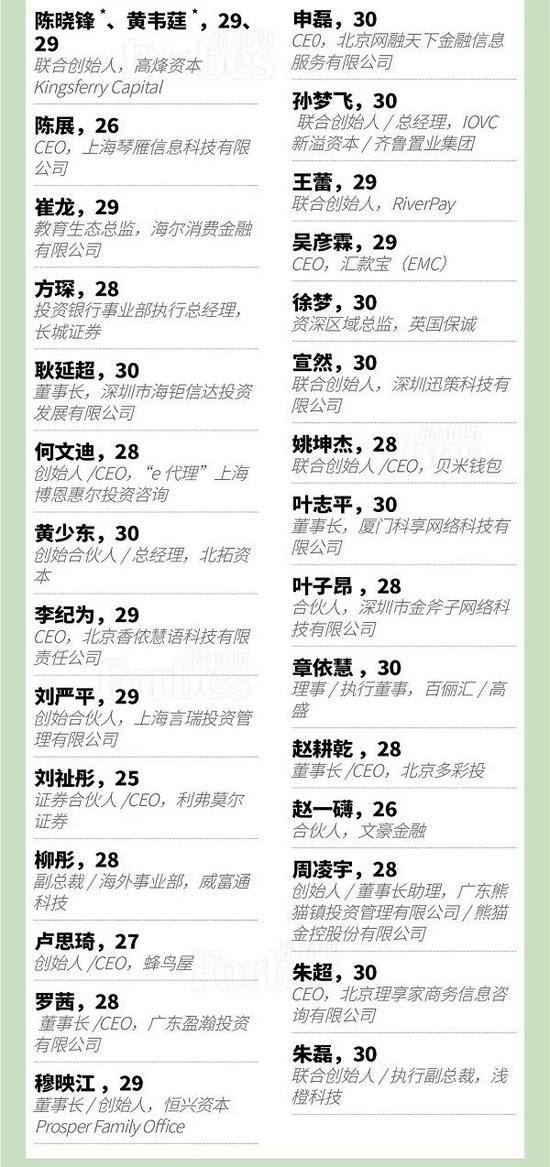 比方说我翻了下本届 2018 年的福布斯中国30岁精英榜当中的“财务和金融”榜单: