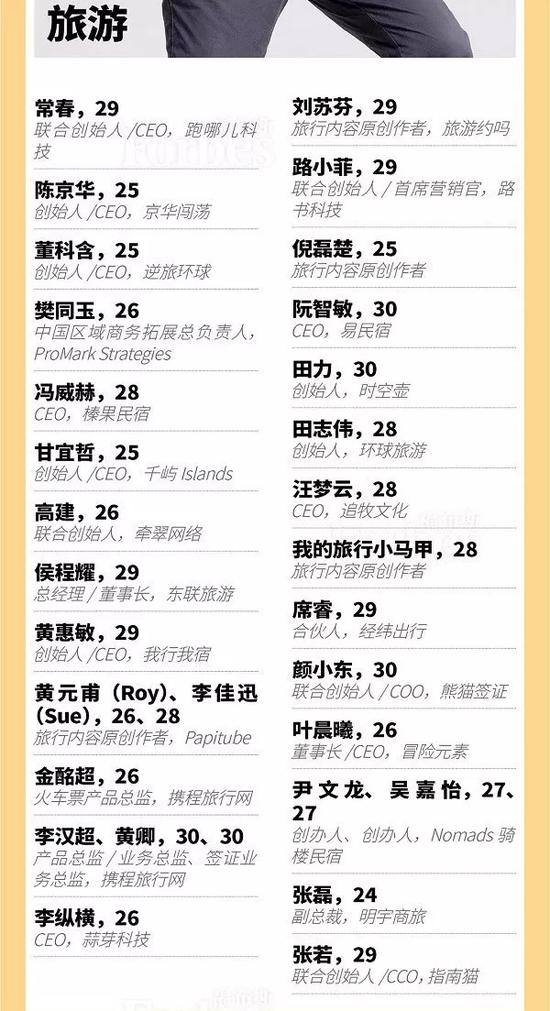 榜单其实也分成了很多的板块,基本上是按照行业划分的。过去几年中国创业格外火热,福布斯在中国推出了30位30岁以下创业者榜单。前面介绍的两位“优秀创业者”,也都是来自于这个榜。