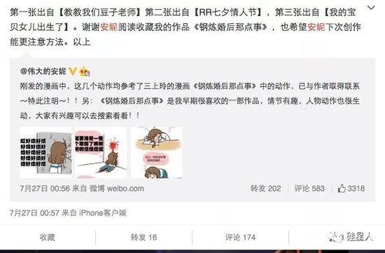 不仅她的App盗图,她本人也多次剽窃过其他画师,两次被人发现抄袭画师三上铃的《钢炼婚后那点事》里面的梗和画面设计。