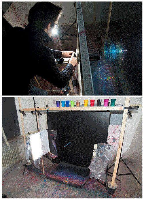 拍摄前,他先把颜料涂抹在一根铁杆之上,另一端使用电钻驱动。在电钻启动的瞬间,颜料随之转动迸发出来,这时他便利用每秒1/40000的高速摄影机捕捉瞬间的色彩。