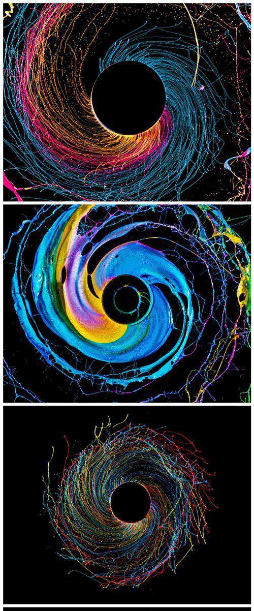瑞士摄影师Fabian Oefner就把物理学运用到艺术创作中。最受欢迎的作品《黑洞》(Black Hole)表现了油漆在向心力作用的瞬间呈现出的绚丽色彩。他在钻头上连接了一个传感器,向摄影机发送指令。