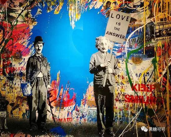 是最近最喜欢的一个物件了。就这张小小的东西,我每天能拿出来看好多次。随意涂抹的浓墨重彩里透出爱心形状的天,爱因斯坦和卓别林,这两位人类史上最厉害的科学家和表演艺术家,共同站立着举着牌,上面写的是Love is The Answer。