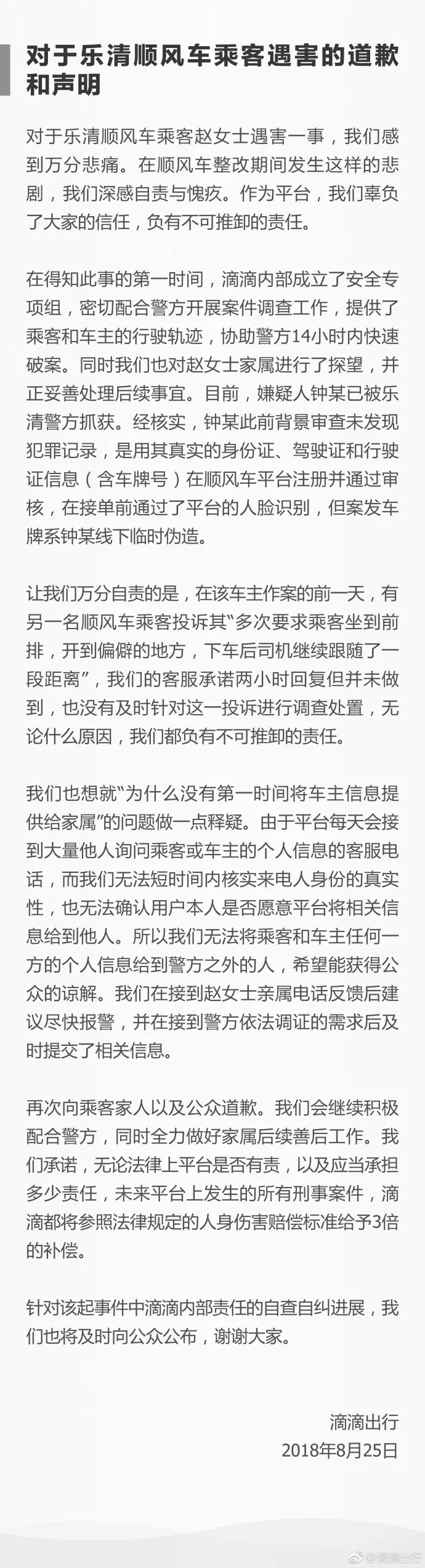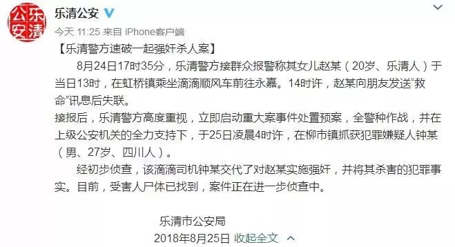 8 月 24 日,温州乐清一个女孩搭乘滴滴顺风车,向朋友发出求救信息后失联,其朋友在微博上发出相关寻人启事。25 日,乐清市公安局证实女孩遇害。而这已经是三个月以来,第二起因滴滴顺风车而起的命案。