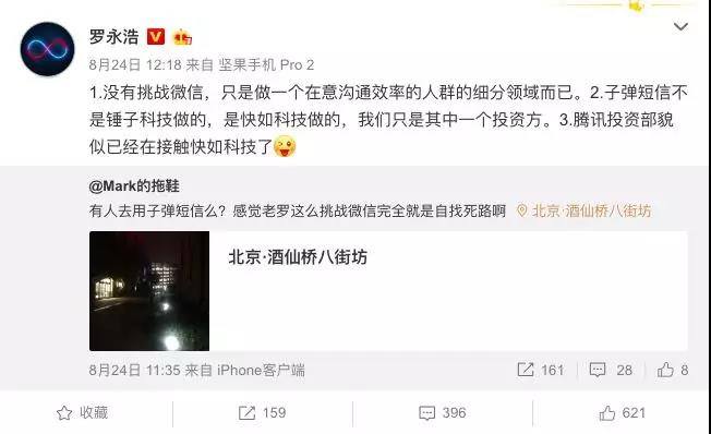在子弹短信备受关注后,罗永浩发布了一条微博:“1.没有挑战微信,只是做一个在意沟通效率的人群的细分领域而已。2.子弹短信不是锤子科技做的,是快如科技做的,我们只是其中一个投资方。3.腾讯投资部貌似已经在接触快如科技了”。